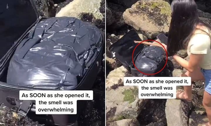 In the video, titled "something traumatic happened that changed my life check," a group of teenagers see the suitcase lying on rocks near the water and decide to go check it out. When they open it, they see that it is full of a black trash bag.