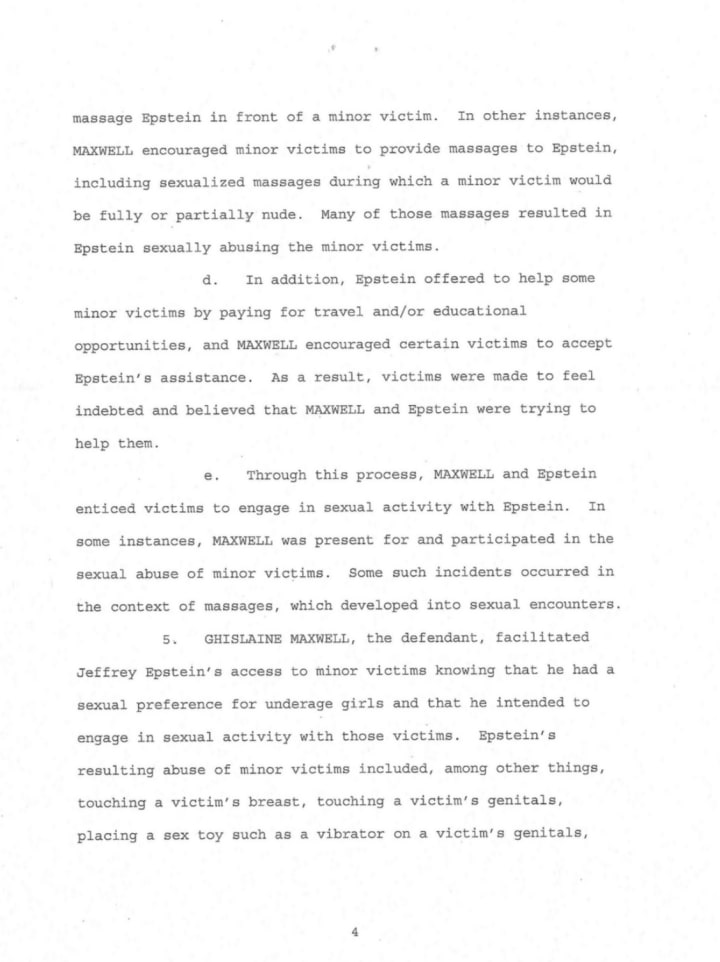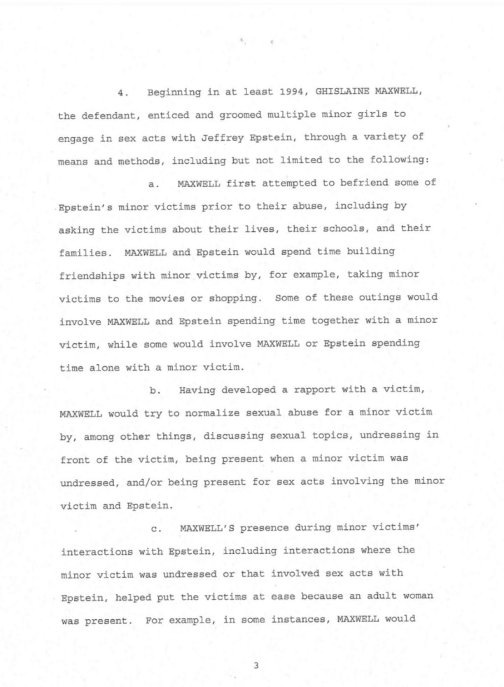 With this list in mind, it is important to try and comprehend how and why those listed are connected to this sex trafficking case. As I mentioned previously, Maxwell and Epstein’s social circles were ones of prominence. The names listed in the above defendants list are names of some of the most prominent and influential figures in world affairs. Also previously mentioned, both Ghislaine and Epstein have a history with espionage. There have been a multitude of insinuations regarding possible black mail and extortion practices by Epstein and Maxwell. Private estates being held as gathering points for waves of high society to flock to in order to indulge themselves in cynical vices. It is believed Epstein along with Maxwell’s assistance, were able to align themselves with the societal elite, entice them into or at the individuals own accord participate in lude, precarious behavior, all while being doxed in the process. It is confirmed Epstein and Maxwell utilized photographs and videos from CCTV footage of those elites with underage girls as blackmail for financial and rhetorical monetization. This was confirmed in unsealed court records that alleged Maxwell kept an album containing photographs of topless girls posing with individuals who visited Epstein's Palm Beach mansion. Claims of the photo and video evidence were confirmed by from a recently released 2016 deposition with Epstein's former maintenance man, Juan Alessi.