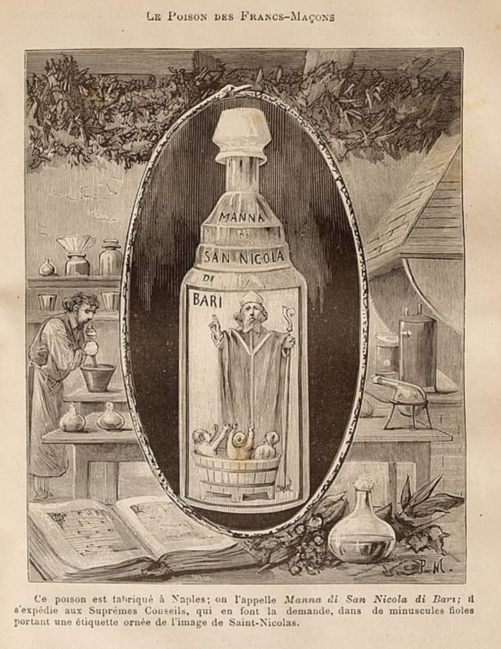 Aqua Tofana was marketed as a beauty product, a facial cream or oil to heal the skin. It came in a small glass bottle or a powder with a label featuring an image of Saint Nicholas, and even called “Manna of St Nicholas of Bari”, the name of a popular cosmetic oil at the time.