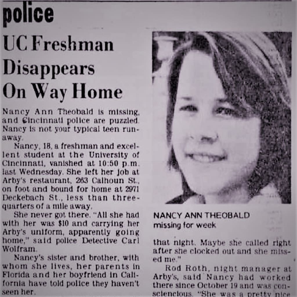 One of Cincinnati's most troubling homicides involved the murder of a brilliant 18-year-old University of Cincinnati student named Nancy Theobald. While attending college, Nancy worked at an Arby's restaurant that once stood on 263 Calhoun Street in Cincinnati. On November 16, 1977, Nancy finished her shift and left before 11p.m. She didn't drive and lived in a nearby apartment at 2971 Deckebach Avenue in Cincinnati with her brother and sister. On occasion, she would call her brother for a ride home.