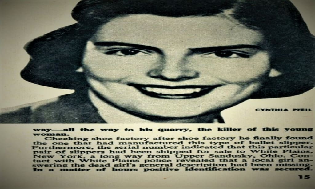 The police became aware that a woman from White Plains had been missing for two weeks. Cynthia Pfeil, 19, had owned the red slippers. Police began investigating Cynthia’s background. She had attended Ohio Wesleyan University in 1952. While there, she met and fell in love with another student named Roy R. Schinagle Jr., who was from Mayfield Heights, Ohio. There was an immediate attraction between the couple.