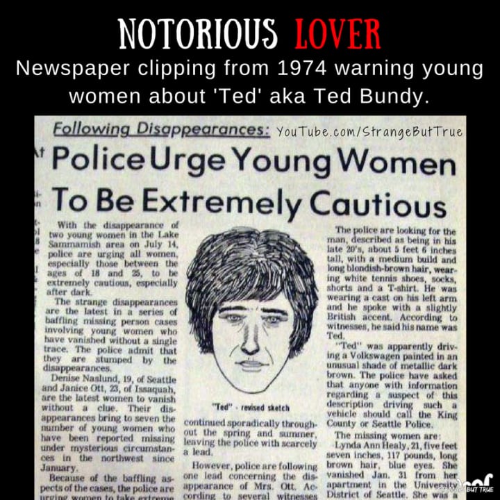 In the beginning of 1974, female college students were disappearing quickly. Some were never heard from again. Some described seeing a dark-haired man wearing a sling on his arm who called himself Ted and asked for help loading things into his car. Others reported a dark-haired man in an alley on crutches with a leg cast struggling with a brief case. Many described his car as a light brown volkswagon beetle. All of the missing women seemed to have little in common, except for their appearance. Young, white, attractive, long and dark hair parted down the middle.