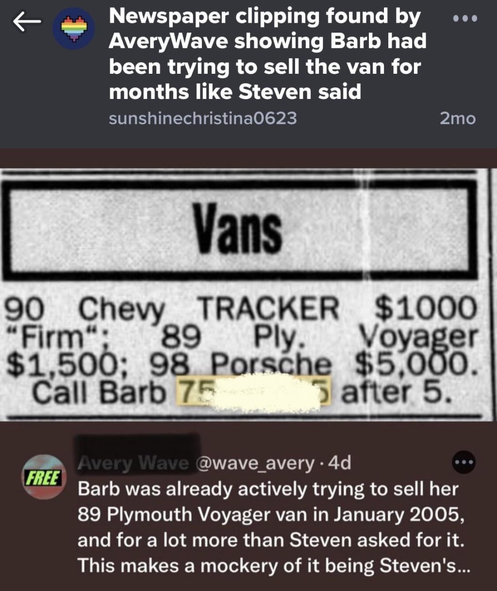 Barb Janda and Steven Avery had discussed placing the maroon van in the Auto Trader magazine in the weeks prior to October 31, 2005. Thanks to the research of AveryWave on Twitter we now know that Barb had also listed the van in the local Manitowoc County newspaper in January of 2005 and as that obviously didn’t result in the van being sold the week prior to Halloween Brendan and Steven got the motor and transmission repaired and the fluid leak stopped. Barb dropped the price and Steven went about finishing up getting it ready to be sold.