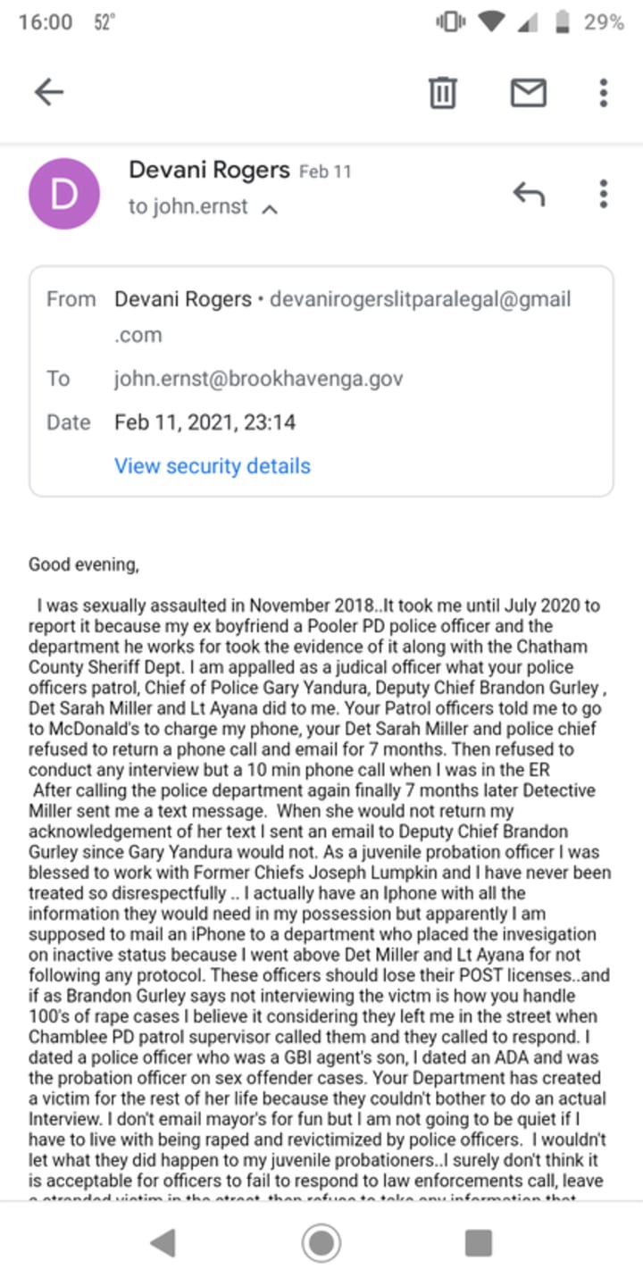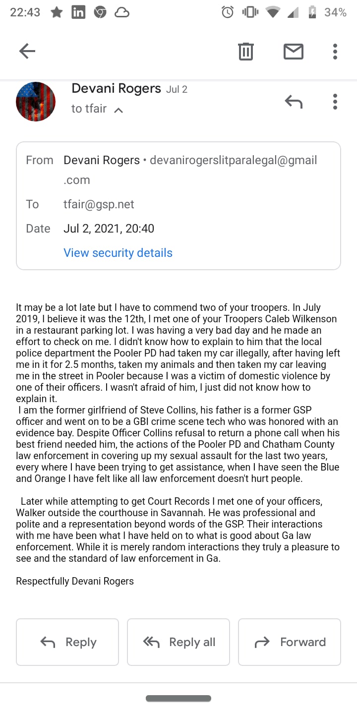 I know you don't have witness protection program but the GSP is and and remains one of the few agencies who I have any respect for. I created a Youth Coordinator position for you to mentor because of my former probationers, because you are the officers who are true standards of leadership, true heroes in my book- you could teach the local agencies much better than their own Chiefs have, or care to correct their ill behavior, who tarnish your badges when they put on a uniform- what to do when a woman reports a sexual assault- not threaten her , or make the sexual assault case inactive for merely going up the chain of command when Detective Sarah Miller would not and still won't speak to a victim of a sexual assault- you can't get probable cause if you won't interview the victim, and so the tow truck driver who violently raped me in November 2018, who I don't know well enough to even know his last name, who left bruises on my arm, barely unable to walk into the Ga Supreme Court and Court of Appeals to get paperwork to help protect the careers of the officers statewide don't care about, one that was one of theirs , one who can remember every detail down to the brand of cigarettes he smokes, the food he ate that I bought him to say thank you for helping me out remains on the streets of Chamblee, Brookhaven and Atlanta for over two years now when the receipt that would link him to the hotel remains in the car Pooler PD illegally took and I am left to pay for, in my icloud I haven't been able to get into since May 2019 because of the Chatham County Sheriff's department taking all my apple electronics, and the Savannah PD Chief Roy Minter refusing to return an email in March 2019, that I have in a broken Iphone, that is in safe deposit box in North Carolina who a Florida FBI agent who was one of my best friend's has had the key to since March 2019 when I mailed it to him.