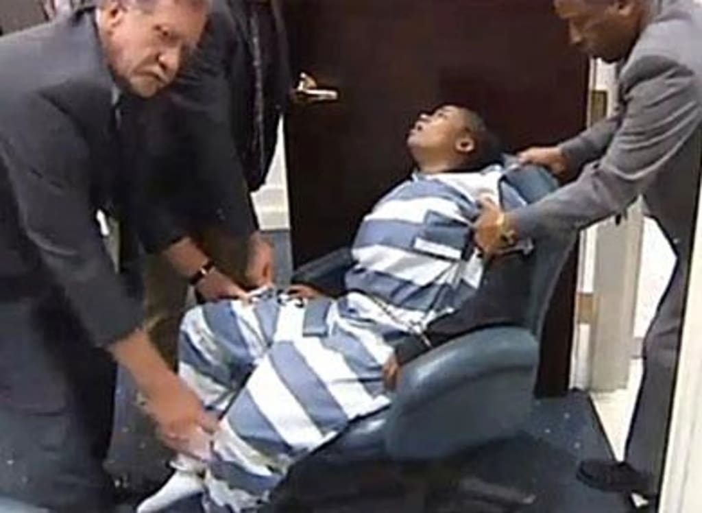 The following defendant becomes enraged after being charged with torturing and killing a four-year-old. He is accused of beating the toddler and submerging the child in an icy bath before killing the young child. The defendant then makes a foolish attempt to attack the judge for mentioning in all of these, charges that the guards are clearly holding him back by trying to fight his restraints.