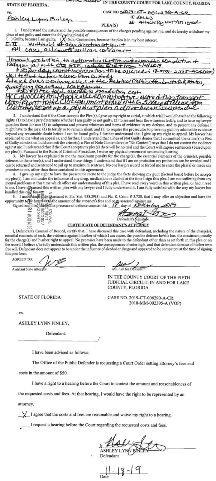 Seven months later, Finley pleaded no contest, and she was sentenced to 10 days in jail and a month of probation. Her friend pleaded no contest quickly, after just two weeks, and only got a week in jail.