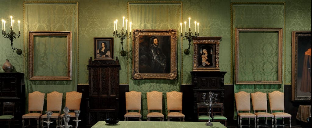March of 1990, in the morning hours of the 18th, two uniformed police officers arrived to the museum, claiming to be responding to a call. The security officer allowed the officers through the employee entrance, unaware the men were not officers of the law. Instead, the pair were thieves. They handcuffed both the guard who allowed them in, as well as a second guard on duty. The guards were lead to the basement, where they were tied up and bound with duct tape.