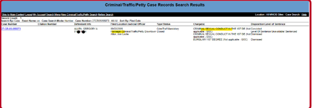 Now Minnesota's DOC website is quite useful in figuring out what the case had resulted in this conviction. There are a couple of links at the bottom. One to the clerk of courts website and the other to the BCA website. Entering Allen's information into the database returns this information.