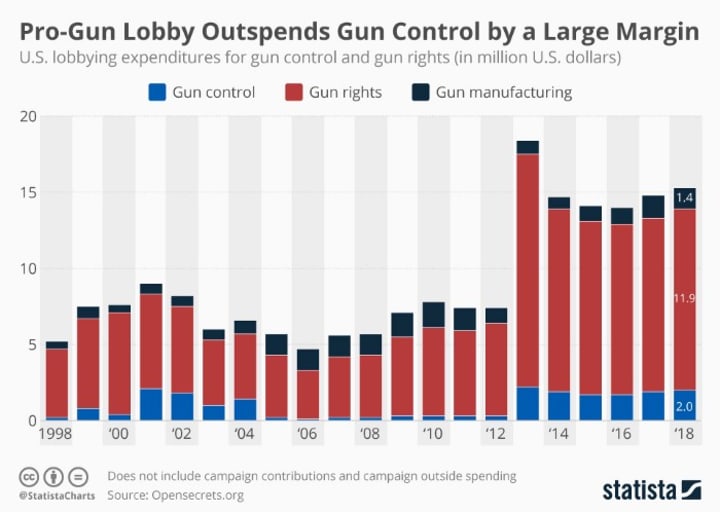 Pro-gun organizations outspend gun control advocates by a larger margin every year. The NRA spending accounted for half of all gun rights lobbying in 2018. Well, maybe there’s a point to why they spend so much.