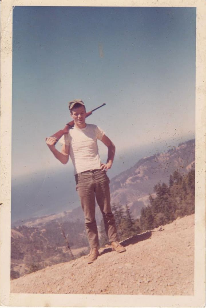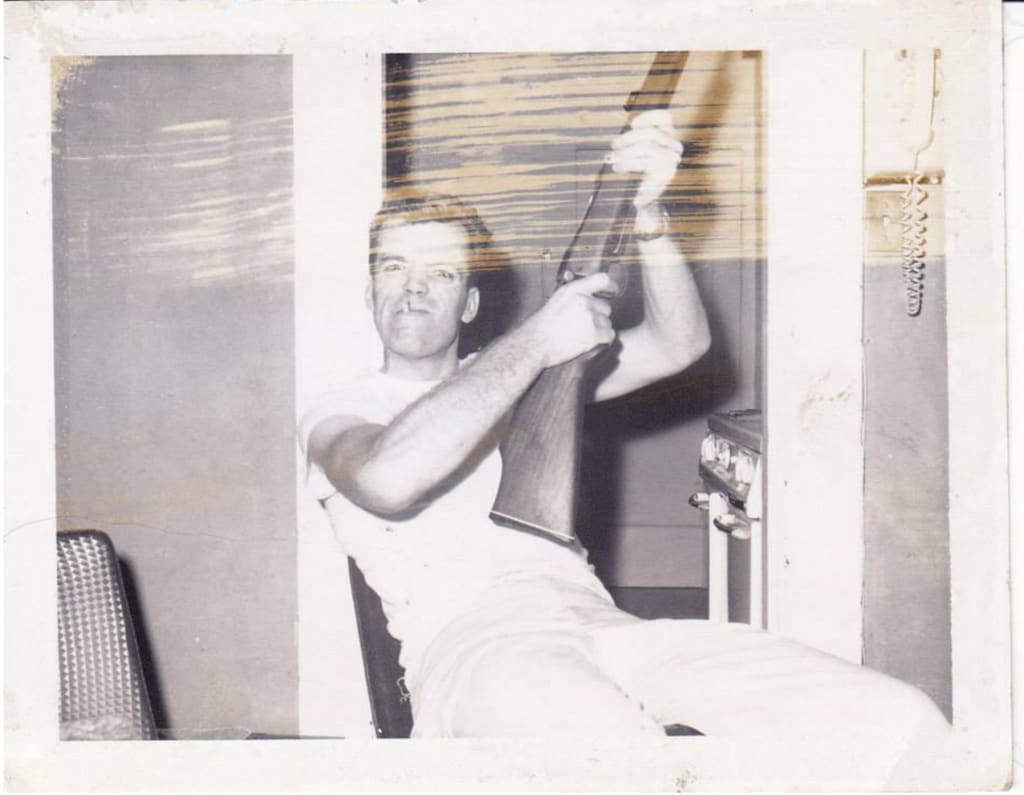 Bill exits the prison doors into a burning sun. Under his arm he carries a small plastic bag of belongings he admitted in '69.