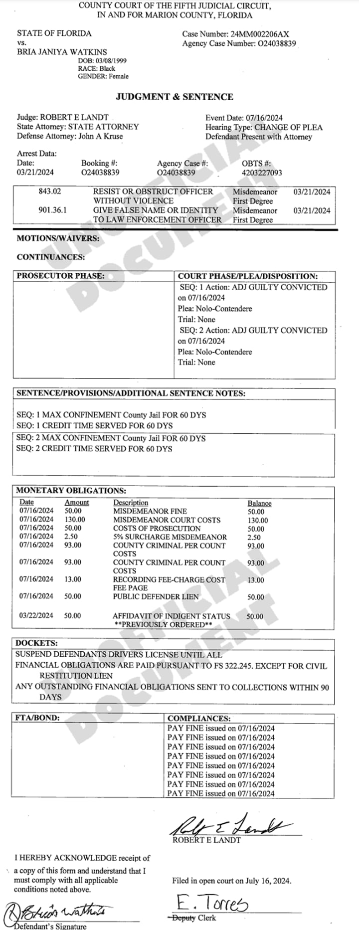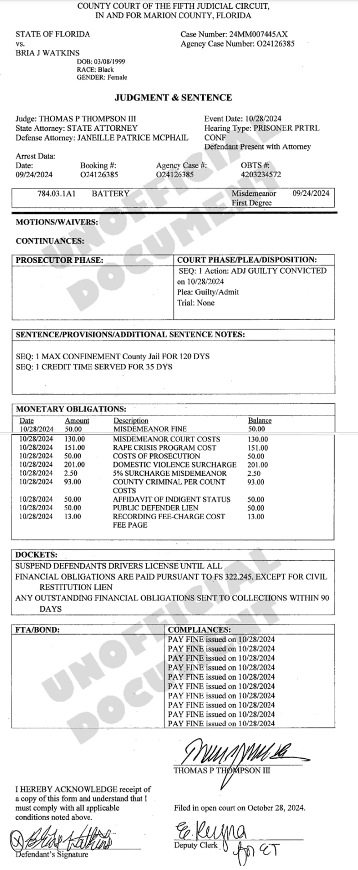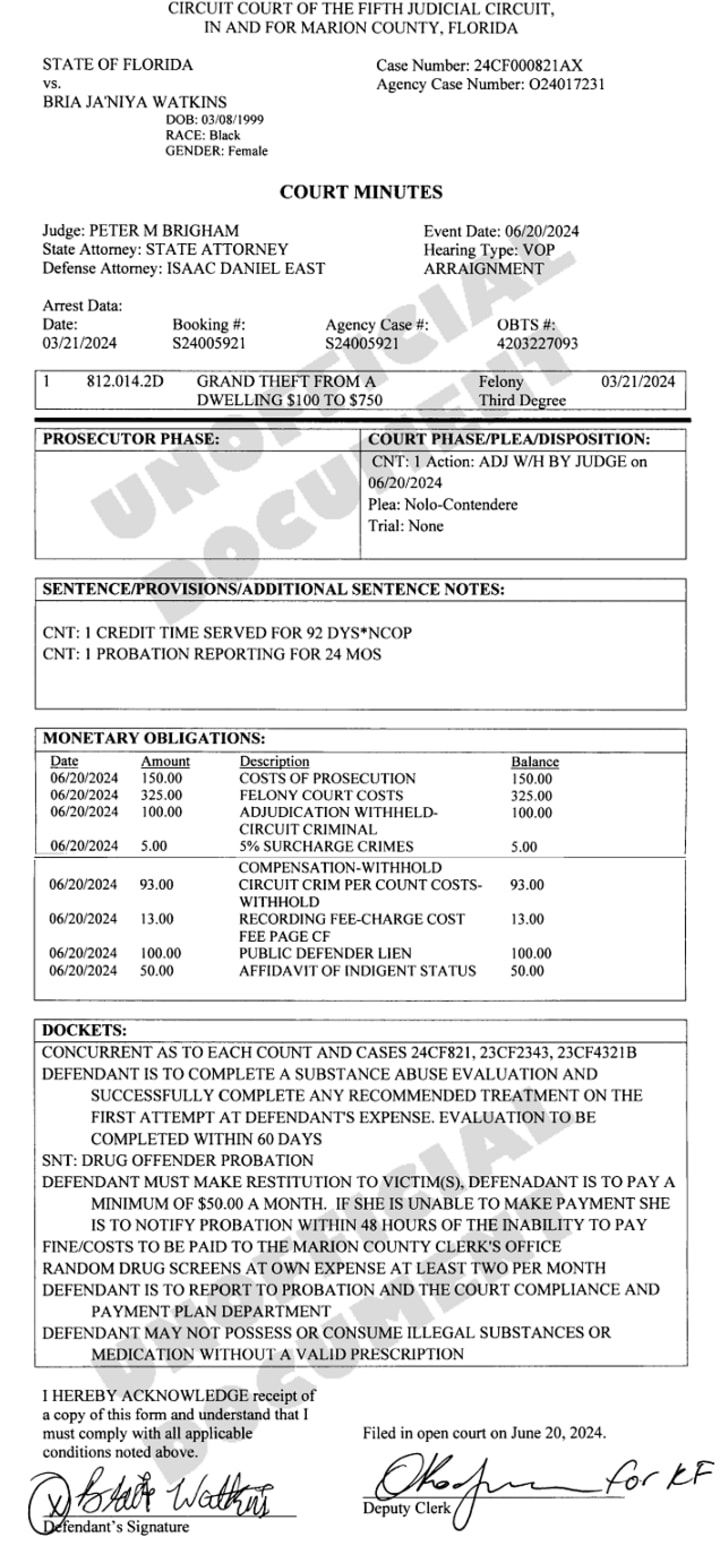 Regardless of where she was, Watkins was arrested on a bench warrant on March 21, 2024. She was charged with grand theft $100-$750 and spent four months in jail.