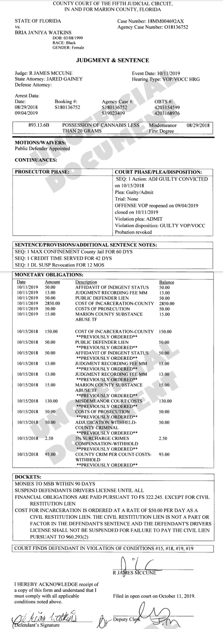 Sure enough, the judge put out a bench warrant and it took until Sept. 4, 2019 – more than a year after her misdemeanor marijuana charge – but Watkins was arrested a third time.