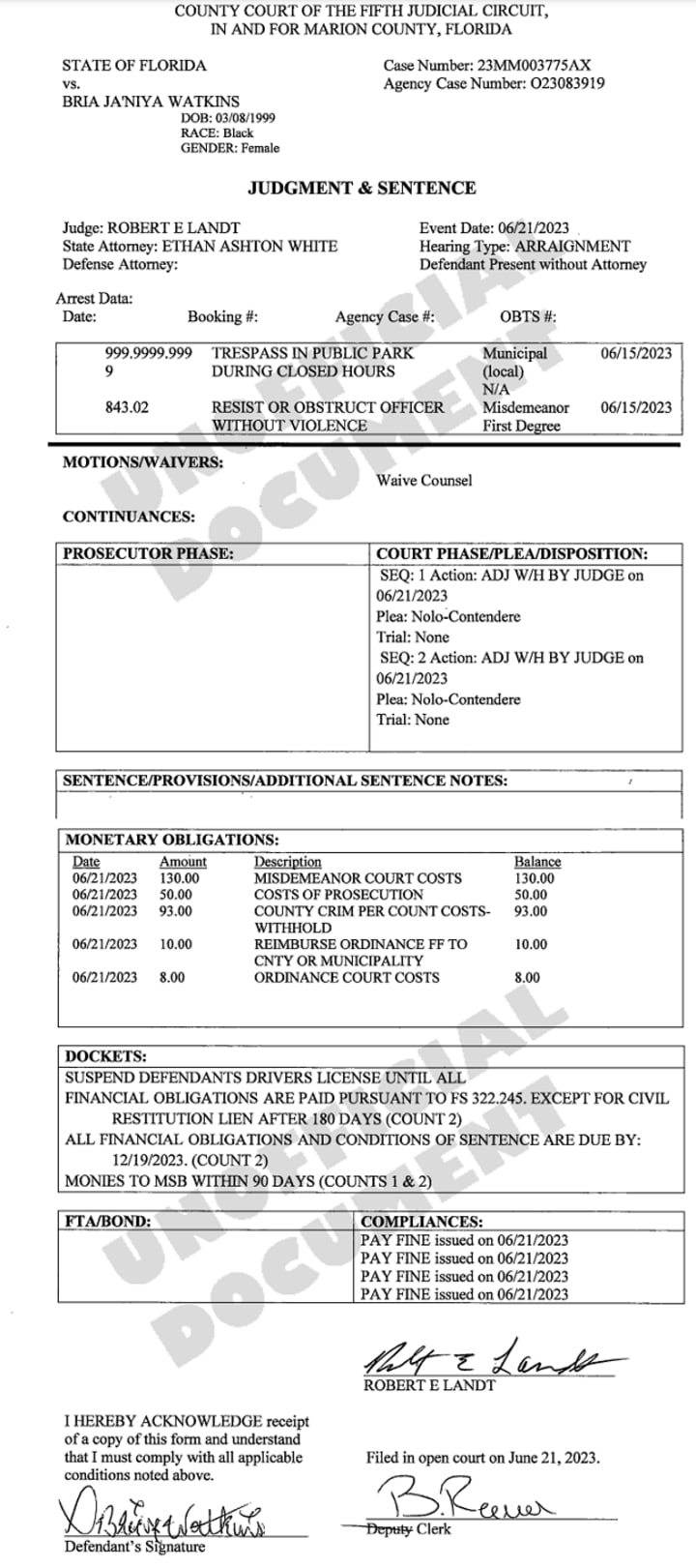 In the first, a Notice to Appear on June 9 said a police officer saw Watkins and two other people entering a park at 4:30 a.m. when it was closed. “Requests were made to speak,” but she “ignored” them. “Assisting officers located Watkins as she was leaving the scene,” and she reportedly “ran. Watkins further resisted efforts to put her in handcuffs, and force was used.”