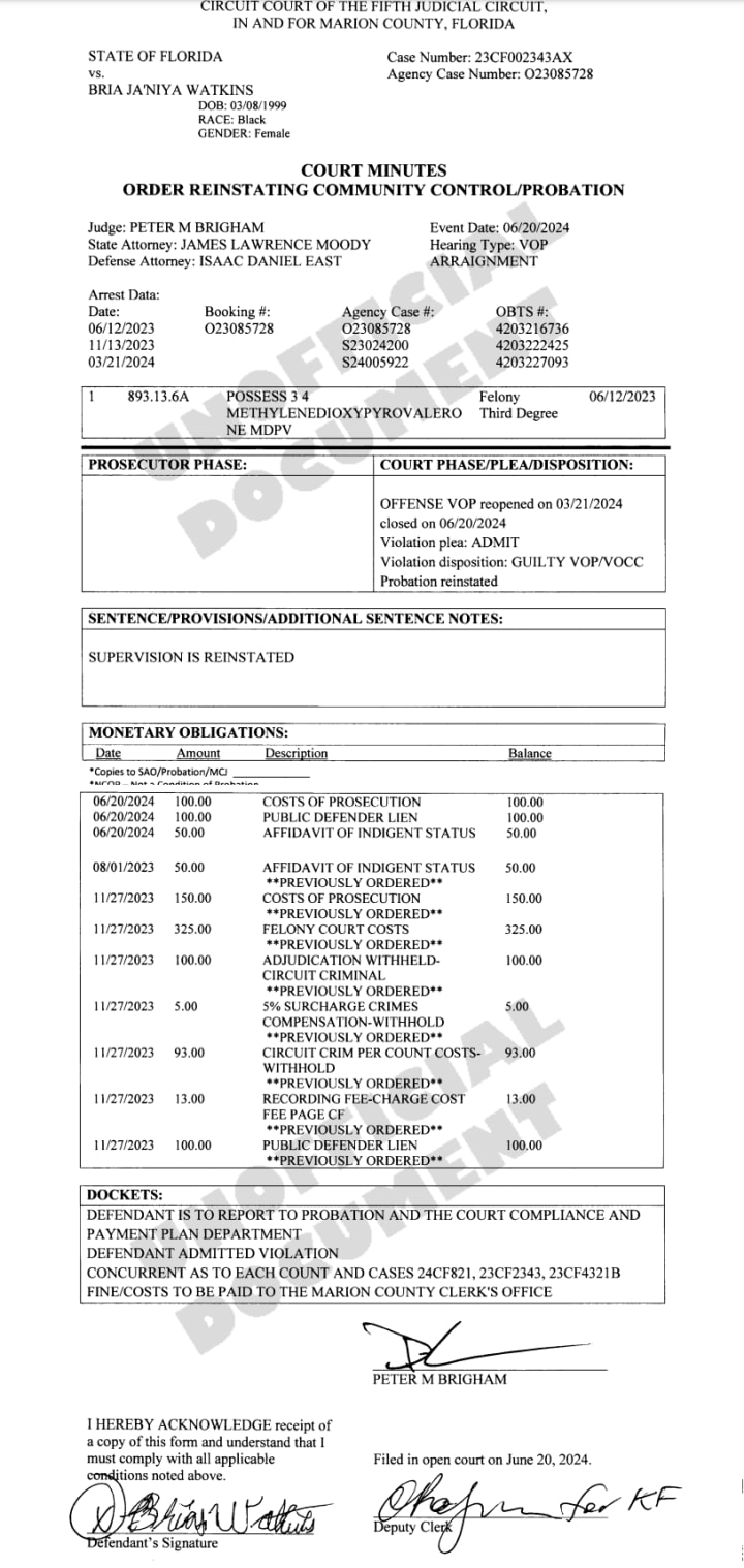 Watkins was arrested on separate charges on March 21, 2024, her bond for the MDPV was revoked while she was in jail, but on June 20, 2024, she admitted her probation violations and was… put back on probation.