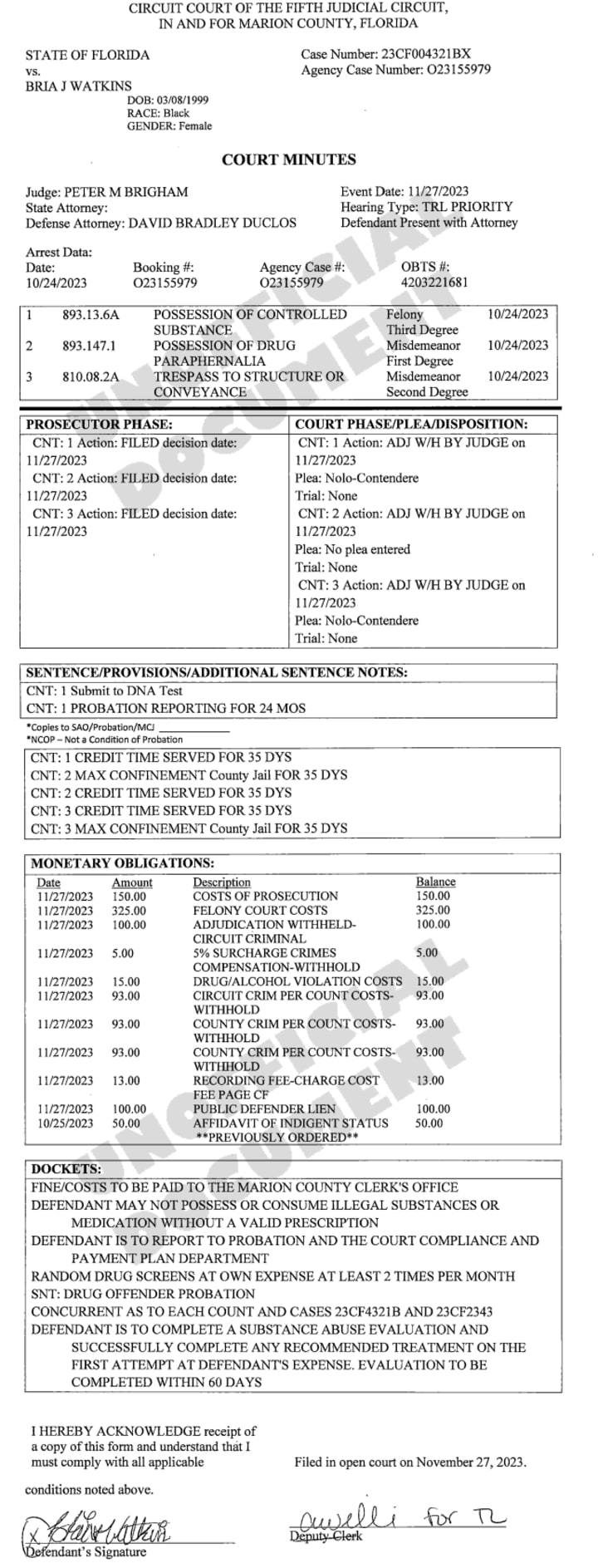 On Nov. 27, the same day Watkins was sentenced on other charges, she pleaded no contest to charges of possession of a controlled substance without a prescription and trespassing, and the judge convicted her of possession of drug equipment.