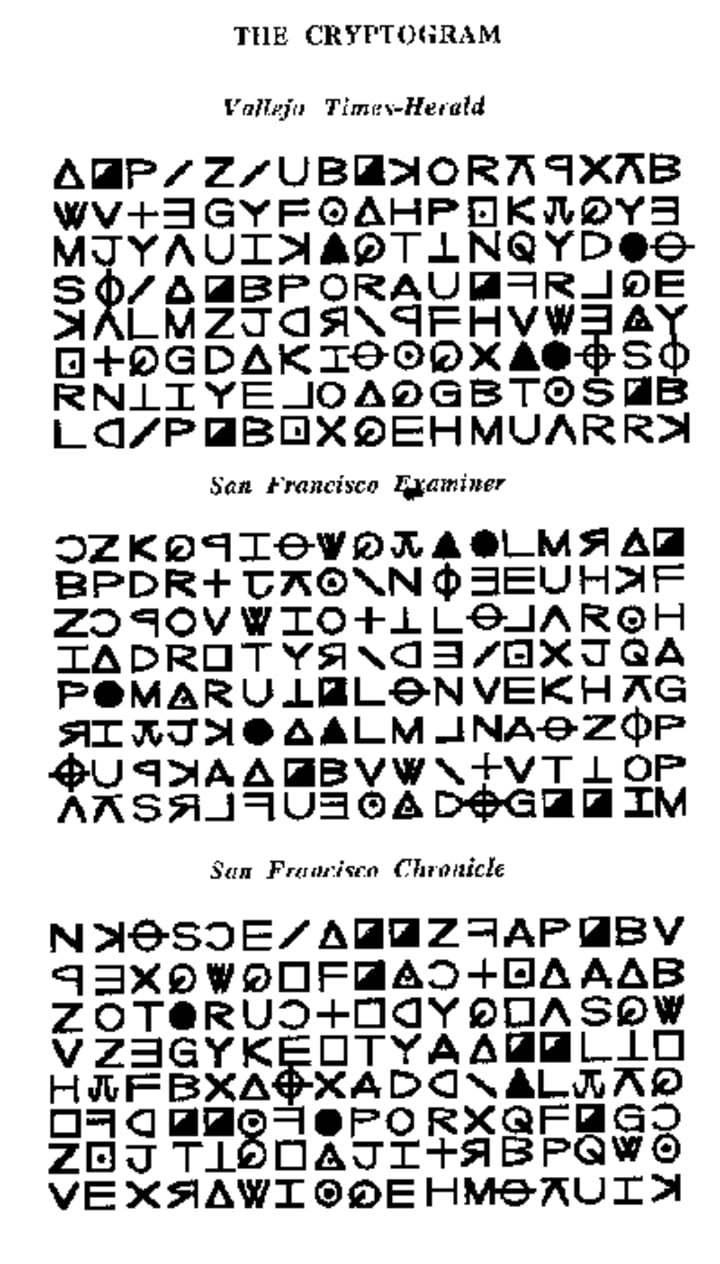 After a killing The Zodiac would often send letters to the local press, demanding they be published or there would be more killings. He sometimes included evidence from a crime scene or a cryptogram. Only two of the four cryptograms sent were ever decoded. The contents were disturbing, but unfortunately did not reveal the killer's identity. Below is what experts believe one of the decoded messages to say;