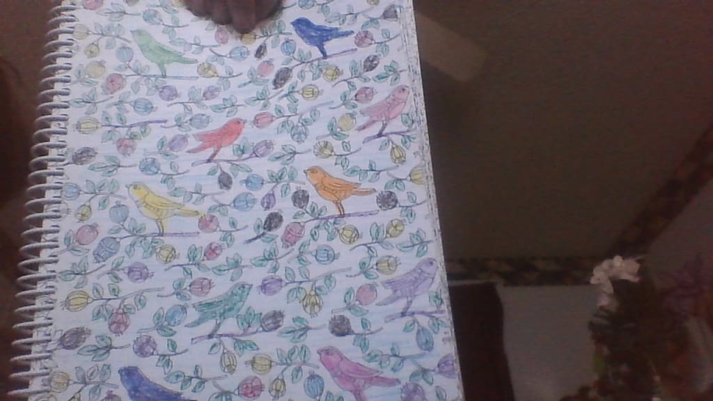 Another one of my color art pictures entitled 'Birds'. I used crayons of the primary colors of red, blue and yellow and a few I decided to make orange. I used brown of course for the branches, and made the all the leaves a shade of green to make it feel like summer. To finish the picture, I used the sky blue colored pencil and shaded in the white space. Please share your thoughts.