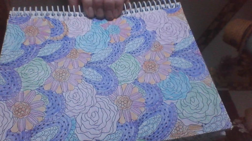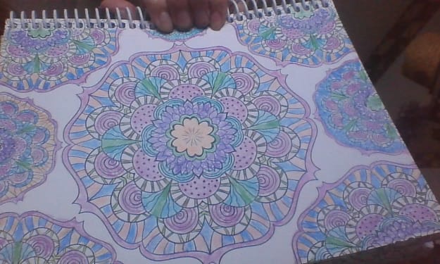 In this color art I assumed these designs were some form of flowers so I used crayons of orange, shades of blue and purples, and a few green. I used dark blue for the flower with the dark spots to offset the lighter 'flowers' to give a balance. Some of the flowers I used a light red in between some orange. Do you think I did the right thing, and I know that art is subjective not objective. Please share your thoughts.