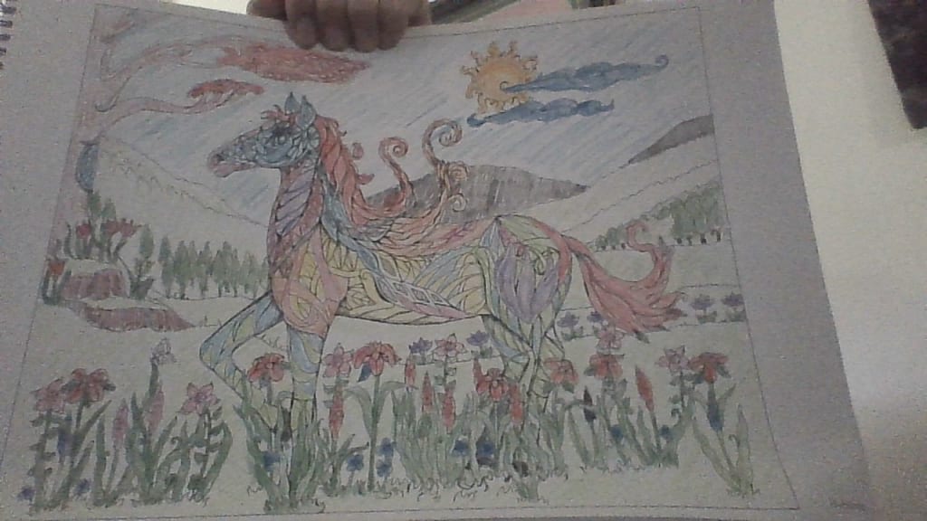 This is a picture of a horse that I pictured as a unicorn minus one horn. With the use of vivid colors of yellow, blue, green, and red I think I pulled off the unicorn idea. I could see a unicorn even though it is a horse walking through the flowers of red, pink, blue and purple picking up more colors on an autumn day with the wind blowing for how I colored the sky to show movement of the sun and clouds. Please comment.