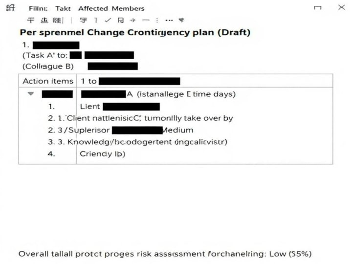 > Summary: Based on the project responsibility distribution, company structure, and recent performance review data you provided, model analysis indicates that your demise would have an estimated impact of less than 5% on the progression of current primary work projects. Your responsibilities could be redistributed and covered within an average of 2.6 weeks. Recommendation: Prioritize creating clear handover documentation to mitigate residual impact and demonstrate professionalism.