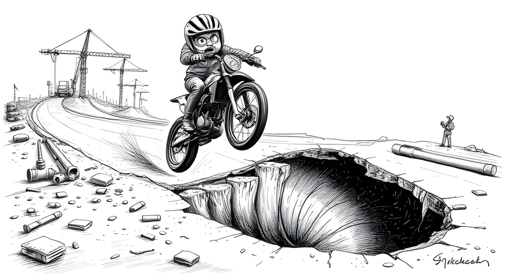 Then, finally, they finish the new road. You're as excited as anything, revving the engine like some kind of mad road warrior. You finally arrive, and your hopeful eyes scan what you just saw. Wait. it's wrong, somehow. For the first time in your existence, you do not get to see the smooth road. You are beholding a surface so badly laid that it resembles something a tool-wielding blindfolded monkey might have conjured. The road gives the impression that it was somehow made by someone who lost focus midway. It's like they decided, "Let's lay down some asphalt, forget the planning and just wing it."