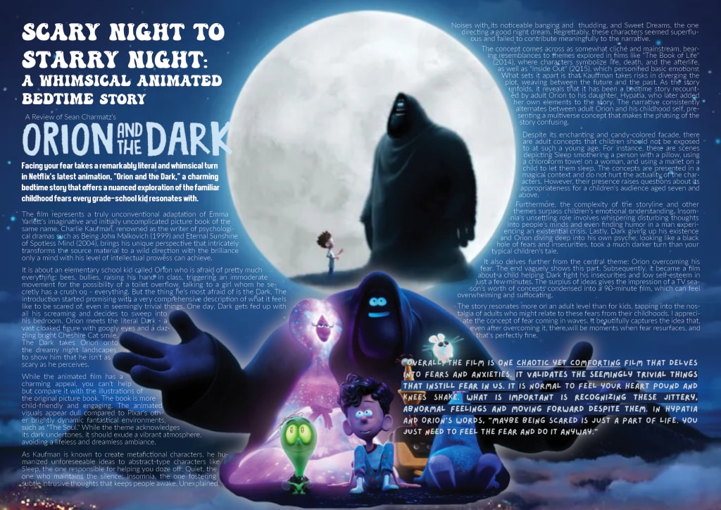 The concept comes across as somewhat cliché and mainstream, bearing resemblances to themes explored in films like "The Book of Life" (2014), where characters symbolize life, death, and the afterlife, as well as "Inside Out" (2015), which personified basic emotions. What sets it apart is that Kauffman takes risks in diverging the plot, weaving between the future and the past. As the story unfolds, it reveals that it has been a bedtime story recounted by adult Orion to his daughter, Hypatia, who later added her own elements to the story. The narrative consistently alternates between adult Orion and his childhood self, presenting a multiverse concept that makes the phasing of the story confusing.