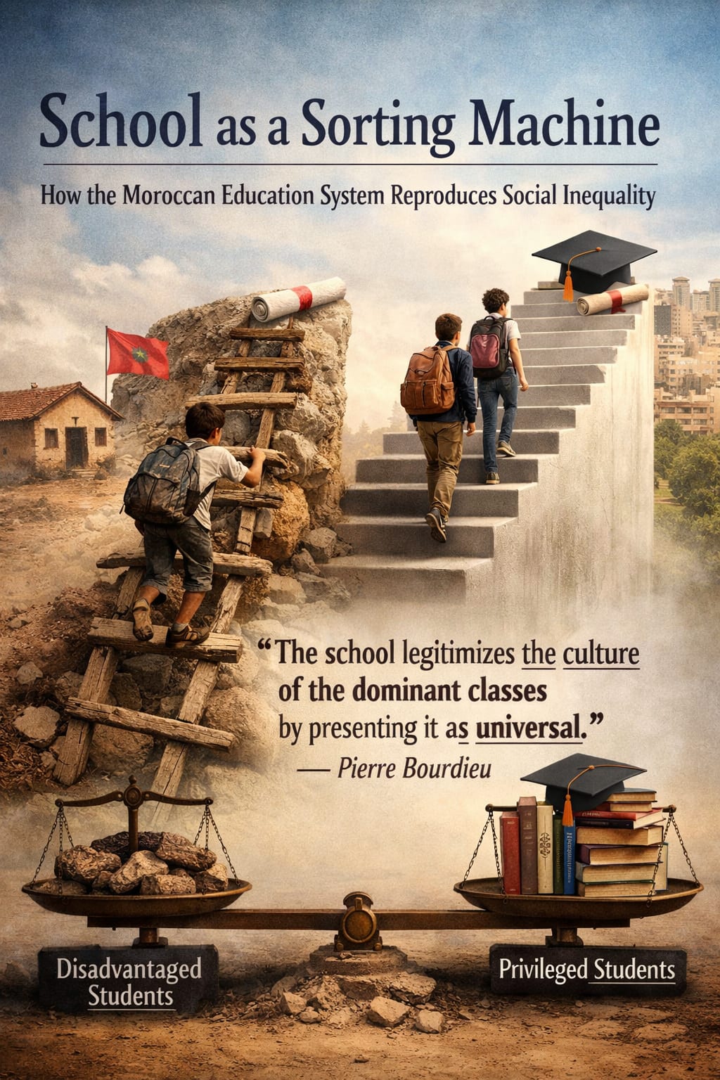 The Moroccan education system does not merely reflect social inequality; it actively participates in its reproduction. Through unequal resources, linguistic hierarchies, and the myth of meritocracy, it discriminates against students from disadvantaged backgrounds while masking this discrimination as fairness. Drawing on the insights of sociologists like Pierre Bourdieu and educators like Paulo Freire reveals that true educational reform is not only technical, but deeply political. An egalitarian education system is possible—but only if Morocco chooses justice over convenience and equality over illusion.