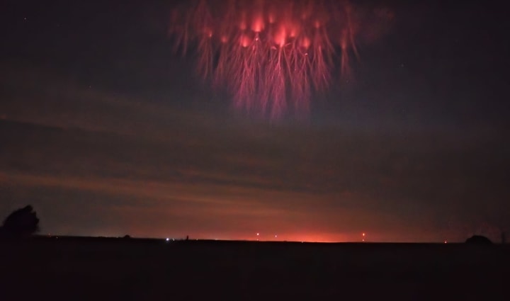 Lightning sprites are electrical discharges which can resemble jellyfish and take place high above thunderstorms. They are triggered when a stormcloud produces a positively charged lightning bolt and the remaining energy is dispersed vertically, creating a red, spindly formation between 30-50km above the cloud.