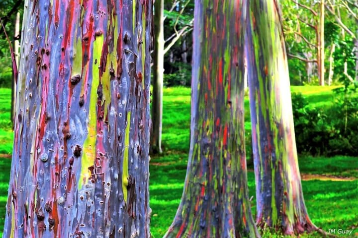 When bark peels off the tree it reveals a bright green color underneath, however this green layer changes color as time progresses - turning hues of orange, blue, purple, brown, yellow and maroon. As parts of the tree are shedding at different rates, the exposed layers can be of different ages and therefore different colors. This is what makes the tree look like it's been streaked with rainbow paint!
