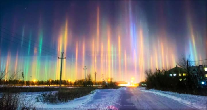 In all seriousness, those aren't giant glow-sticks; but still something equally spectacular. These are light pillars, a rare optical phenomena in which ice crystals in the atmosphere reflect sources of light in a vertical formation. Long, illuminated beams form above or below sources of artificial or natural light due to the air being extremely cold, creating a dazzling, ethereal, effect. Beam me up, Scotty!