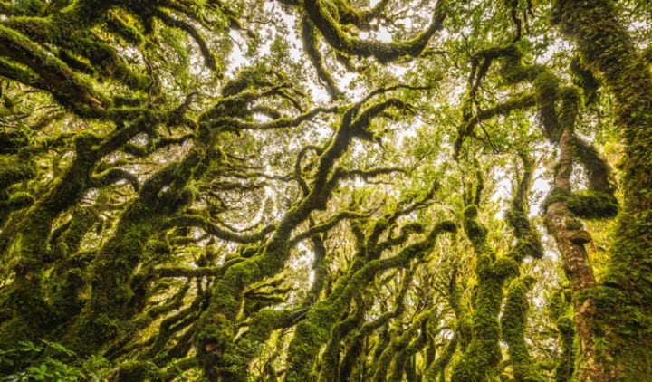 An extraordinary species of tree - the kamahi tree - is responsible for the forest's crooked appearance. Over thousands of years kamahi trees have grown around existing trees, their branches entwining to create unique twists and nobbles. The growth of moss on the trees has also helped to create the appearance of a magical forest that you would only expect to read about in fairytales.