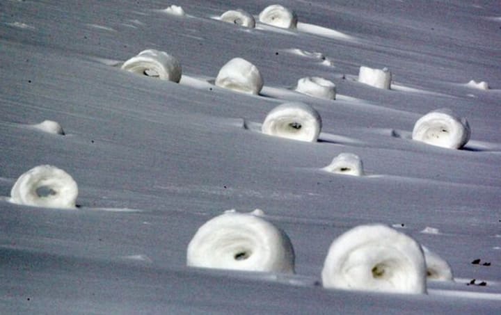Snow donuts - or as I like to call them, 'snonuts' - are a phenomena which occur when the wind blows snow over a snowy layer of ground and other ice particles and material are collected along the way until large rings or 'rolls' are formed. Be careful though - you might get brain freeze if you try and bite into one of these!