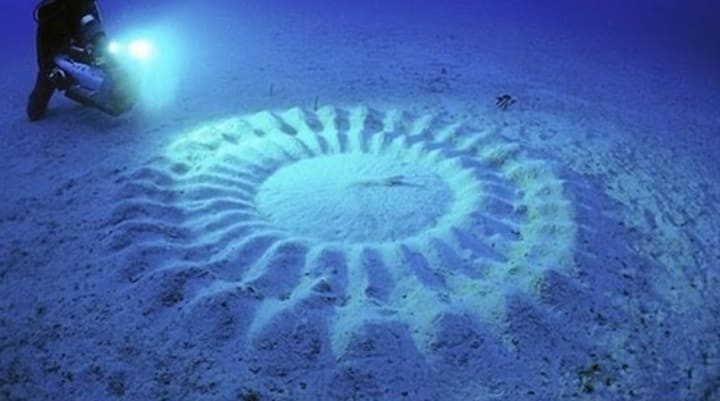 I'm joking, of course. Although these pretty circular formations look like something out of a science fiction movie, there is a simple - but fascinating - explanation for them. It's our good friend the male Japanese pufferfish, who occasionally takes up a career as a sand artist to attract a mate.