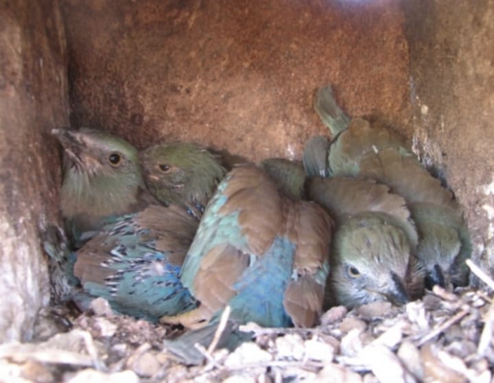 The young of the Eurasian roller, like the Potato beetle, will smother themselves in body fluid to prevent becoming food for a hungry predator. But this time, the shield is made of puke. Baby birds coated in vomit don't look or smell good, so predators are less inclined to consume them. The parents will also detect the vomit, and they will swiftly return to the nest to fend off the danger, which is typically a hawk or a snake. The only bird that has been seen communicating with vomit is this one.
