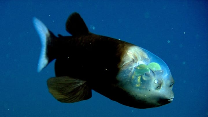 This strange fish has a transparent head, with its eyes inside the skull. It uses them to look upward while staying perfectly still.