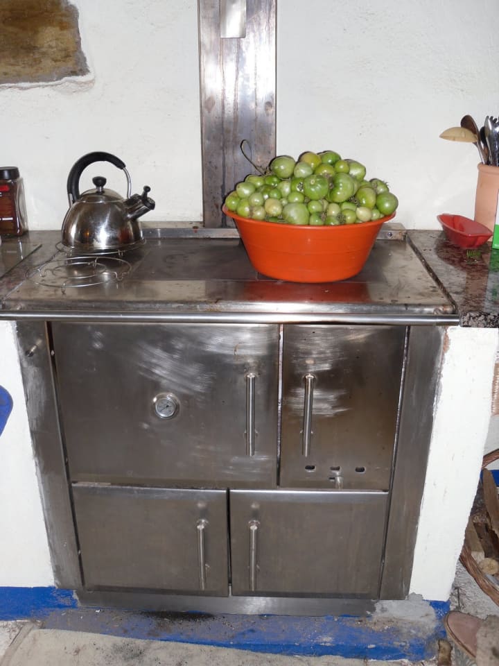 This lovely stainless steel giant of a thing is now the heart of our home , it not only cooks our food for free but is keeping the kitchen/dining room lovely and cosy with the added bonus of drying the washing on the drying rack that hangs above on a pulley system . The chimney pipe goes up through the ceiling to the upstairs room which will be a lounge one day and takes the chill off up there too. The wood is free as we've worked like trojans all summer to collect it from the forest and cut & stack it in the barn, we still aren’t sure we'll have enough though. This is a steep learning curve for us we haven't quite mastered yet . It does mean we will be greener,(its scrap wood and would be left to rot if we didn't pick it up) and 20 euros a month better off as we save a bottle of gas for the cooker every month now.