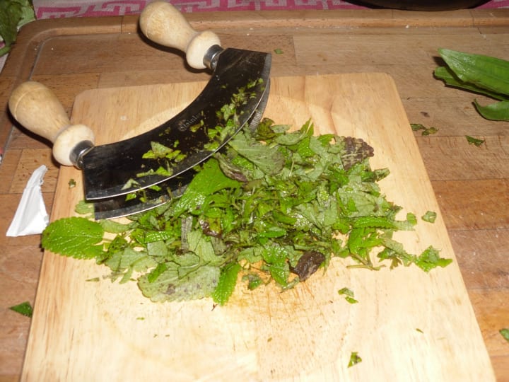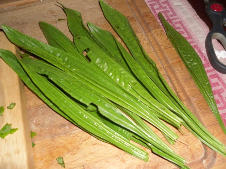 Chop together a good handful of comfrey leaves, Lemon balm, and Plantain leaves, a weed which grows almost everywhere, (plantain pictured below for identification)