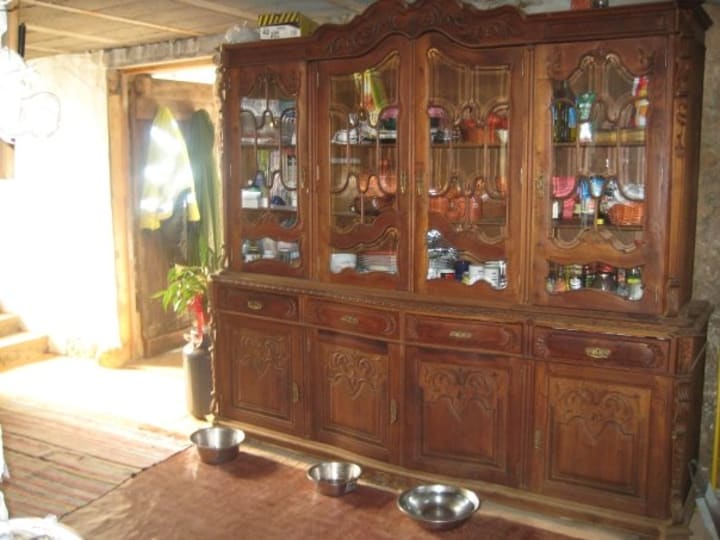 Yes it's a tad 'rustic' but it's very funcional, and it's just my style. I truly love it. Nothing cost us much or most of the time, anything at all. The shelves are made from wood from the forest, yes those dining chairs are really plastic garden chairs, hahahah we've had them almost five years now. They will stay until we find other better chairs which are as comfy as these!