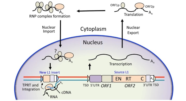 When the DNA encoding a retrotransposon is transcribed into RNA, the RNA can then be converted back into DNA. The retrotransposon proceeds to cleave open the cell's genome and insert its new DNA, thereby adding another copy of itself to the genome. This process not only expands a species' genome size over generations—nearly half of the human genome consists of transposable elements—but also poses a risk of cellular damage.