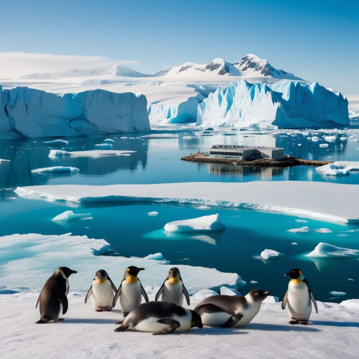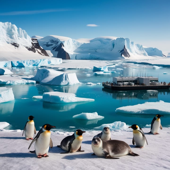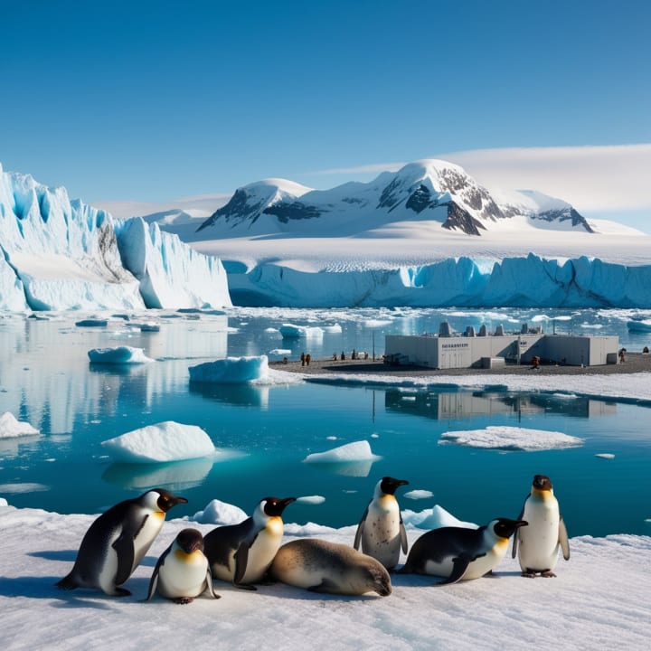 This breathtaking image highlights Antarctica's icy grandeur and its critical role in Earth's ecosystem. Towering glaciers dominate the landscape, while penguins and seals thrive along the frozen shores. In the distance, a research station symbolizes humanity's pursuit of knowledge in one of the harshest environments on Earth. The Southern Ocean, teeming with marine life, underscores Antarctica’