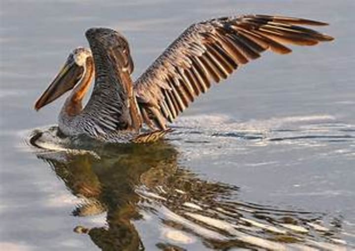 Brown pelicans are striking birds with dark, gray plumage, white necks, and notable throat pouches. They mostly hunt for fish, diving from great heights to snatch the fish from the water. These birds inhabit coastal regions.