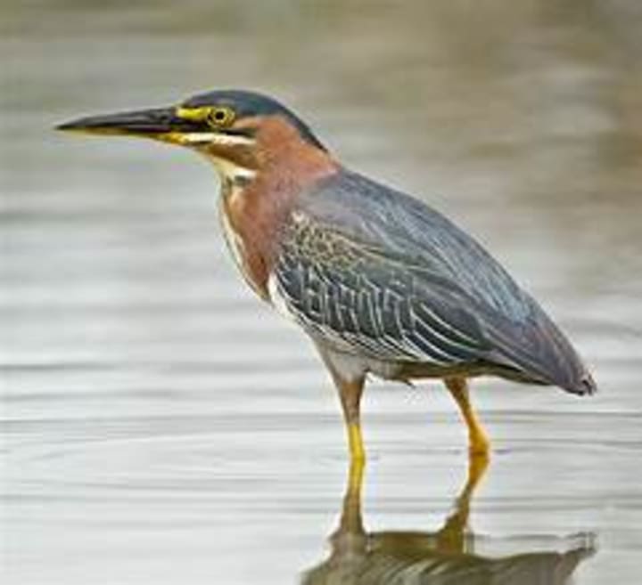 Green herons are recognizable for their gray-green back and chestnut-brown heads. These are small birds with dagger-like bills and have a distinctive "skeow" call, especially when alarmed. They are very adaptable wetland birds inhabiting shallow waters like in swampy thickets. Green herons are carnivores dining on fish, insects, amphibians, crayfish, invertebrates, earthworms, leeches, dragonflies, grasshoppers, small rodents, lizards, snakes, frogs, and tadpoles.