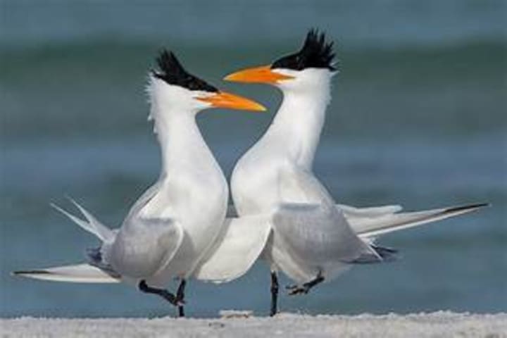 Royal terns live in sheltered areas with shallow water like estuaries, bays, lagoons, and sandy beaches. These birds are social, often gathering in colonies for nesting and resting. Royal terns inhabit coastal areas and are often seen resting on beaches in groups. They have a black cap on their head and a long, slender bill, which aids in their fishing technique. Royal terns are carnivores and eat fish, squid, shrimp, and crabs.