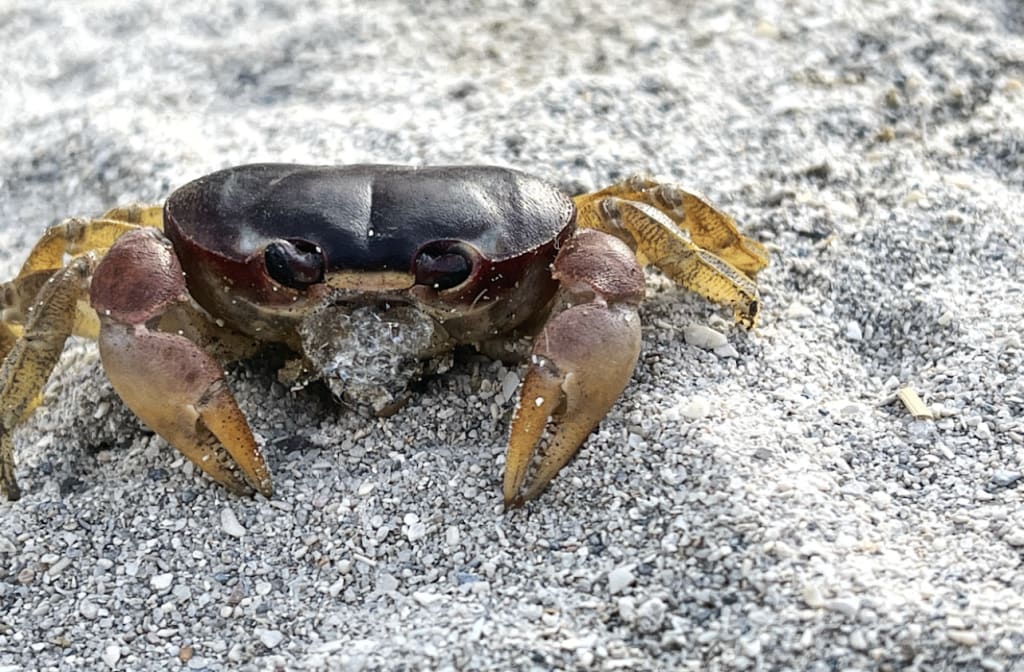 On this particular morning the air was humid, but the breeze was crisp. After watching the sun rise, I spent an hour walking along the beach, dipping my toes and watching the boats in the distance. I felt a few droplets of rain and decided to run back along the path by the beach. As the rain drops grew heavier, I picked up the pace, but stopped in my tracks when I spotted a tiny crab, standing still in my path.