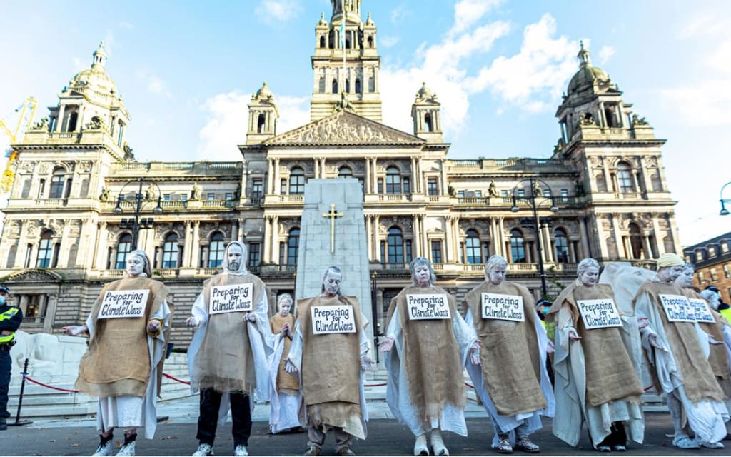 Activists gather outside Glasgow’s JPMorgan Chase bank, protesting the company’s financing of fossil fuels. Chalky, dehydrated “penitents” stand shoulder-to-shoulder with “Preparing for Climate Wars” signs around their necks. | Photo courtesy of Extinction Rebellion Scotland and Simone Rudolphi