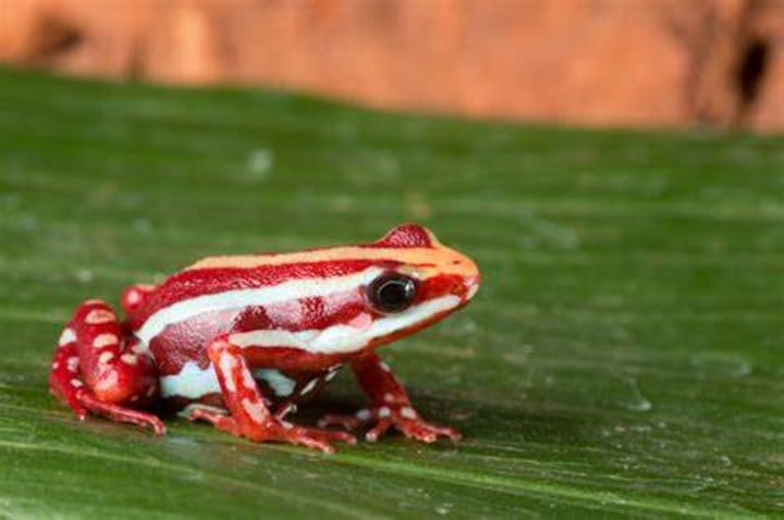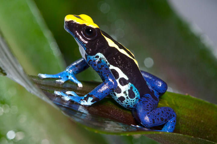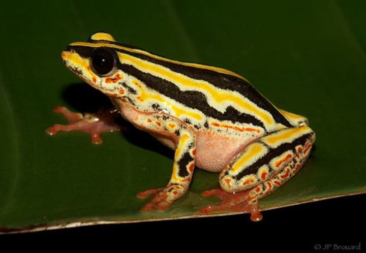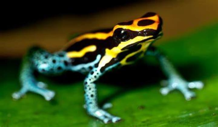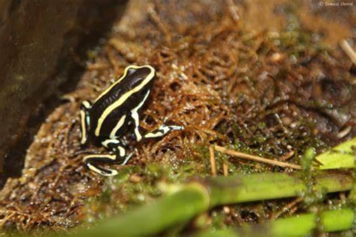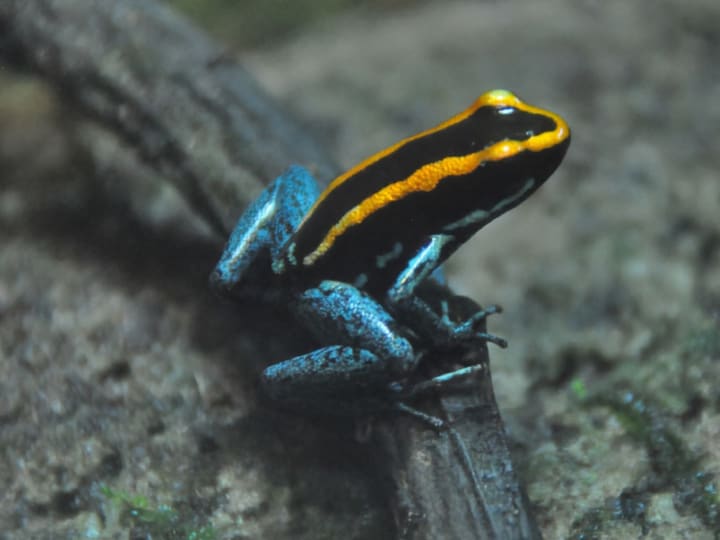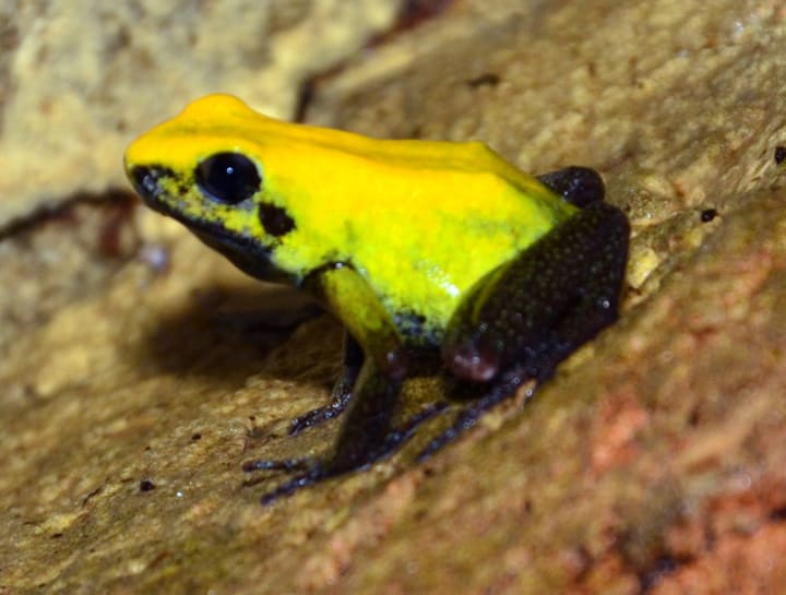 Native to Columbia, the yellow-striped poison dart frogs look as bright as the sun. These are the least toxic of their genus. However, they're deadly enough to cause predators heart failure with their toxin when they are eaten.