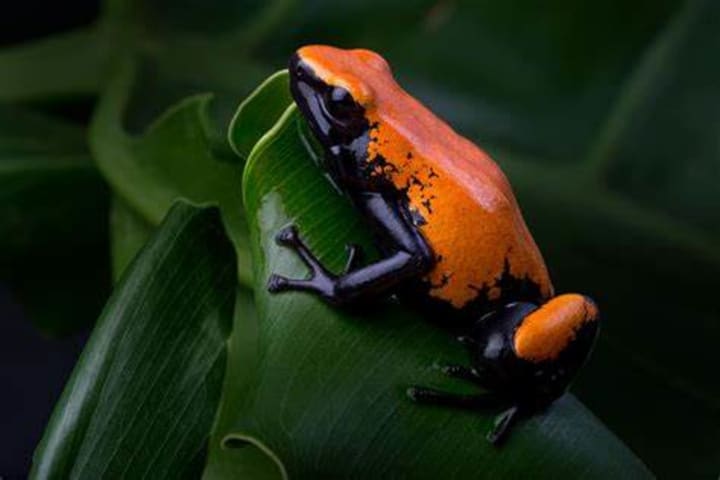 In the rainforests of Columbia, black-legged dart frogs are the second most toxic ones. They have orange or yellow bodies with dark blue or black hindlegs and forelimbs.