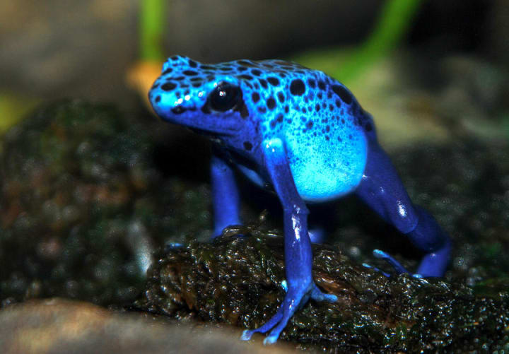 Living on some isolated rainforest islands in the Sipaliwini savannah of southern Suriname blue poison dart frogs have a bright blue hue with black spots. When these frogs are in captivity they lose their toxicity and because of this have become popular to capture and sell as pets.