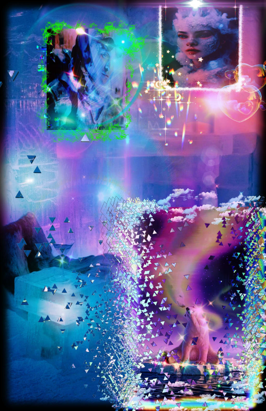 It was cold outside in the deep capacity of the arctic caves, where underground the mad scientist Mr Freeze had last been seen. Isolated from being exposed to toxic chemicals and excommunicated for being a criminal, he had endured many years still practicing his chemistry. He missed his wife Nora who did not survive her isolation chamber, and it became too cold to exist in the frozen world anymore. He made plans to relocate to the moon and build a breathable living structure. There with his beloved polar bears he began working on a idea of creating a brain enhancement formula that would allow animals to speak. The chemical structure would consist of only organic material. He became a bee keeper and was delighted that the honeycombs adapted to the synthetic moon trees. The bees imported were revived from ancient amber, still holding the imprint of dna from prehistoric bees. The genetic code within the dna he discovered had a series of short and long dashes that resembled the ancient iChing based around the Yang Yang. Could they communicate in this manner, understanding the related elements of summer & winter, wind & heaven, fire & thunder? He thought a bee could have the awareness of the earth, and even know heaven. He then recorded the vocal patterns of his bees and when transferred to his oscilloscope he could see the buzz sound as a long dash, and the zzzzt sound as a short dash. It was indeed a electrical phenomenon of extra sensory perception that the ancient bees could have invented although they were all drones. His Queen bee he had imported from Madagascar where she obtained a unique bubble of flashing light that twinkled as she sat on her throne inside the hive. She was as rare as a cicada bug that mysteriously grows glitter upon her wings. He could have studied dolphins or parrots to learn animal language, but he wanted to start with a electrical specimen that had the power of electrical current. He wanted to transfer the bee voltage where he could feel it’s electricity and did so by constructing a wooden river table that he poured honey into, sealing it with added lighting. Working on the moon in zero gravity was time consuming as his movements were slower underneath the dome of a sunlamp lit laboratory. He hadn’t worn his ice helmet since he left the frozen wasteland, as the new environment allowed him to breathe without it. Existing within the dome of electrical generators was unnatural, another reason why he wanted to create bee energy. The Department of Justice knew he was there, as well as his rival, Batman, who paid him sweet annual visits just to see how a man could hold up on the moon. It was good for some light conversation as the world below revolved making him feel like a Superhero. He still loved his Polar Bears who adapted well to the lunar surface, giving him the notion to play Dr Doolittle, if one could talk to the animals, it might free his ball and chain. The key was the bees, but a land animal such as his bears would only hear noise, not capable of deciphering a i Ching code. It was like a seashell that hears the sound of the ocean when held up to the ear. How the shell keeps the sound within its chamber is another mystery that takes time to manifest. Moon water had appeared in the bear’s habitat where they bathed inside the crater. The good ole boys from the police department delivered fish packages for them which they ate along with homemade honey. After awhile the bears did start to communicate with their paws in the moon sand in a series of long and short dashes. Freeze was pleased that they had learned this from the honey, as they progressed in time to a written bear language. In order for they to speak, he thought he needed to add something from a bird to the honey. Eureka! He thought of the little bird that wings moved almost in a mechanical rhythm, the Hummingbird. He added hummingbird nectar to the honey. To his discomfort nothing manifested, until one day he spotted someone walking outside his compound. It wasn’t difficult tracking the footprints in the moon dust, as the moon had grown in size in his years of ostracism. Giant craters hurled at him from shadowy peaks that made the powdery dust seem alien. Then underneath a pillar, he spotted a landed rocket ship with Russian insignia. Opening the hatch, he found two Cosmonauts who grinned a strong greeting to the estranged Mr Freeze. Freeze studied them for a moment taking in the scenery. Vot are you looking at? One who’s name was Yuri asked. Mr Freeze said, Shouldn’t your walls have religious icons? Ve don’t hang them anymore, we have better things to do. The one named Boris replied. Mister, whoever you are, ve are not alone. Yuri motioned to the hall leading to other rooms. There in the murky moon mist stood a female alien that Freeze found most intriguing. Don’t worry about them, her eyes spoke with her lips not moving. Freeze gave her a long look, noticing that she too was a frozen spirit, he asked who she was. They found me in my capsule in a deep sleep and revived me. She glided to another compartment, Freeze followed leaving Yuri and Boris to dissolve in the background. She floated in the air drawing him closer. They think I am a ancient entity, being in stasis for a millennium, the original Cleopatra. Her eyes were like fire, holding his attention. Do you want to see the city? There’s a city? Freeze hadn’t seen one. But of course* She drifted out of the hatch door like a puff of smoke with Freeze following reluctantly until they were in a valley he hadn’t known to exist. There in the sunlit sand he saw what looked like crystalline remnants of a past settlement. A ancient rock formation city that crumbled shards of skeleton domes that made him wonder what type of alien life had existed there. There he found a crystal alter that had a glowing specular also made of fine crystals. Next to it stood inside a case of glass, a glistening Pope hat small enough for a alien. The mys