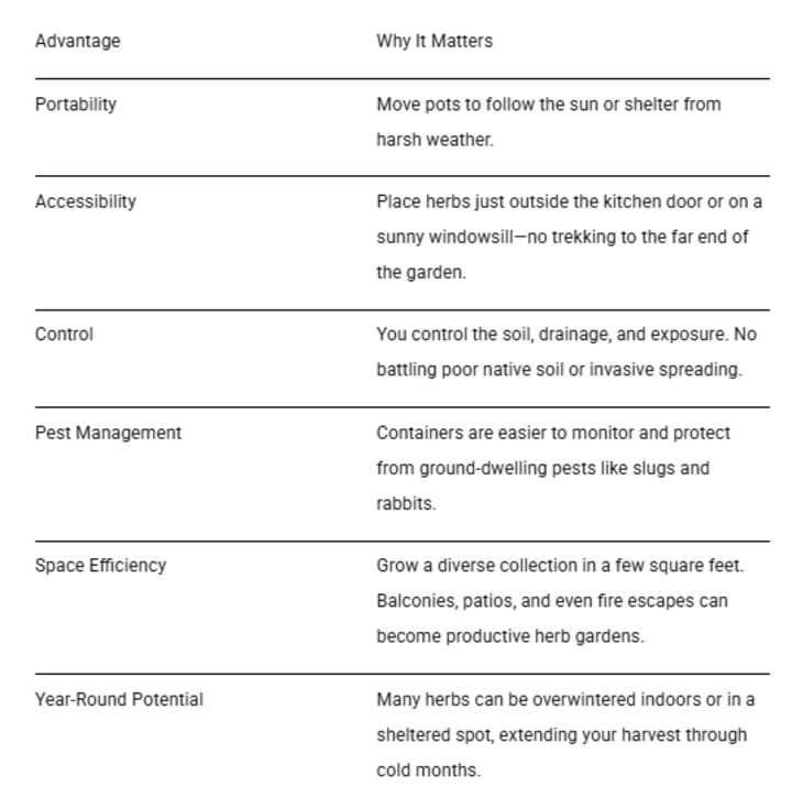 The single most important rule of container herb gardening is drainage. Without it, roots drown and rot.